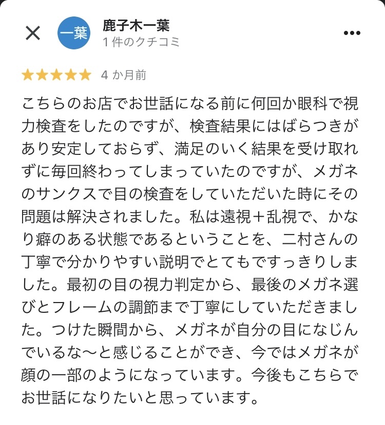 私は遠視+乱視で、かなり癖のある状態であるということを、二村さんの丁寧で分かりやすい説明でとてもすっきりしました。最初の目の視力判定から、最後のメガネ選びとフレームの調節まで丁寧にしていただきました。つけた瞬間から、メガネが自分の目になじんでいるな~と感じることができ、今ではメガネが顔の一部のようになっています。今後もこちらでお世話になりたいと思っています。