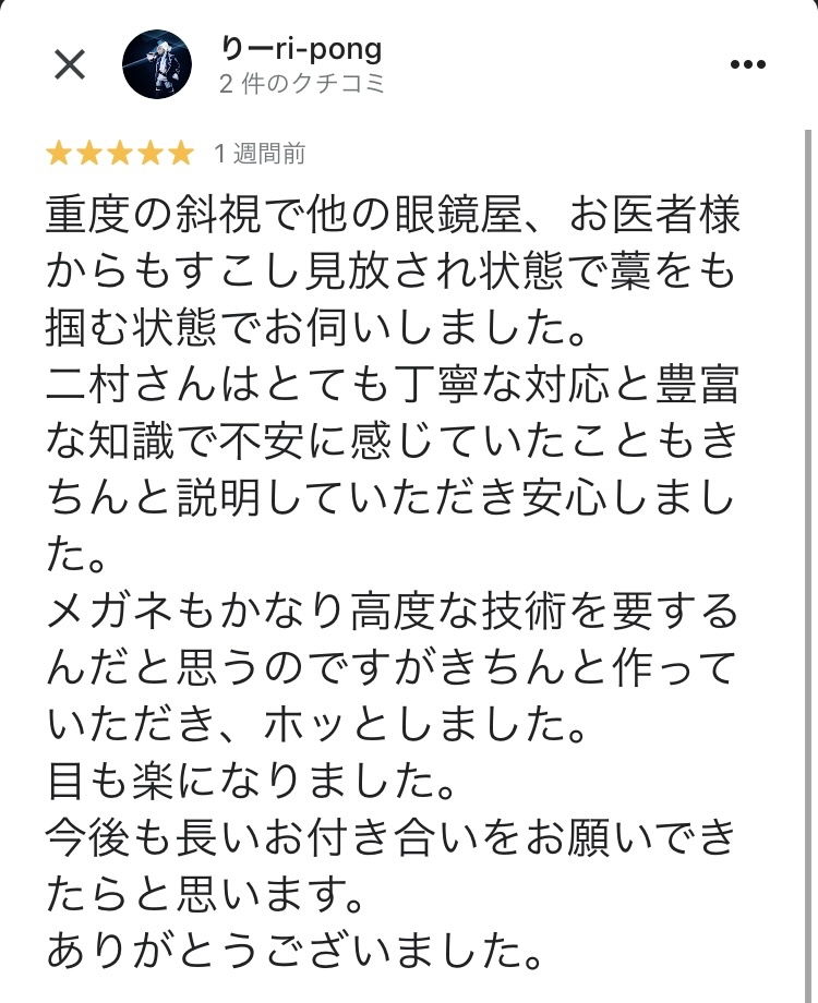 重度の斜視で他の眼鏡店、お医者様からもすこし見放され状態で藁をも掴む状態でお伺いしました。 二村さんはとても丁寧な対応と豊富な知識で不安に感じていたこともきちんと説明していただき安心しました。 メガネもかなり高度な技術を要するんだと思うのですがきちんと作っていただき、ホッとしました。 目も楽になりました。 今後も長いお付き合いをお願いできたらと思います。ありがとうございました。