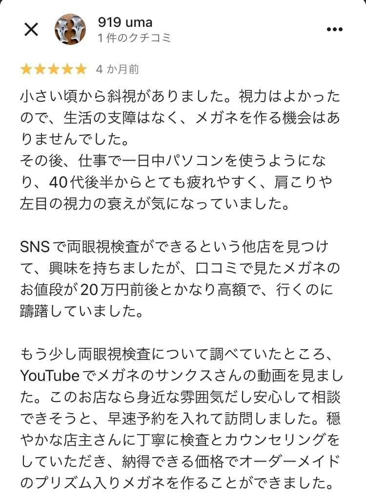 穏やかな店主さんに丁寧に検査とカウンセリングをしていただき、納得できる価格でオーダーメイドのプリズム入りメガネを作ることができました。
