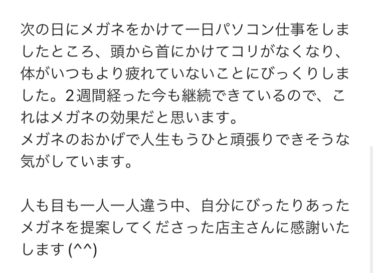 次の日にメガネをかけて一日パソコン仕事をしましたところ、頭から首にかけてコリがなくなり、体がいつもより疲れていないことにびっくりしました。2週間経った今も継続できているので、これはメガネの効果だと思います。