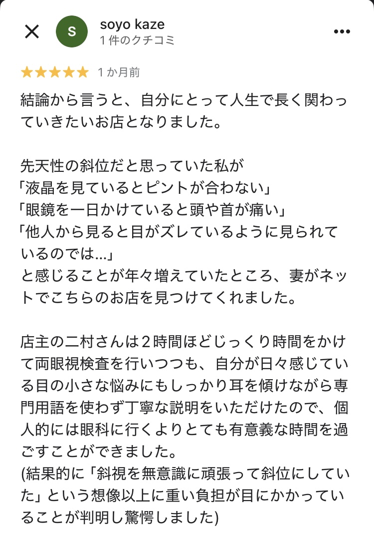 斜位や斜視の自覚が無い方でも、目に何かしらの不安を抱える方は一度予約の上での訪店をおすすめします。(ちなみに私の妻もその1人で、斜位から来る症状が劇的に改善しました。)