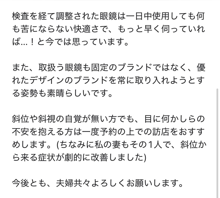 検査を経て調整された眼鏡は一日中使用しても何も苦にならない快適さで、もっと早く伺っていれば...!と今では思っています。
