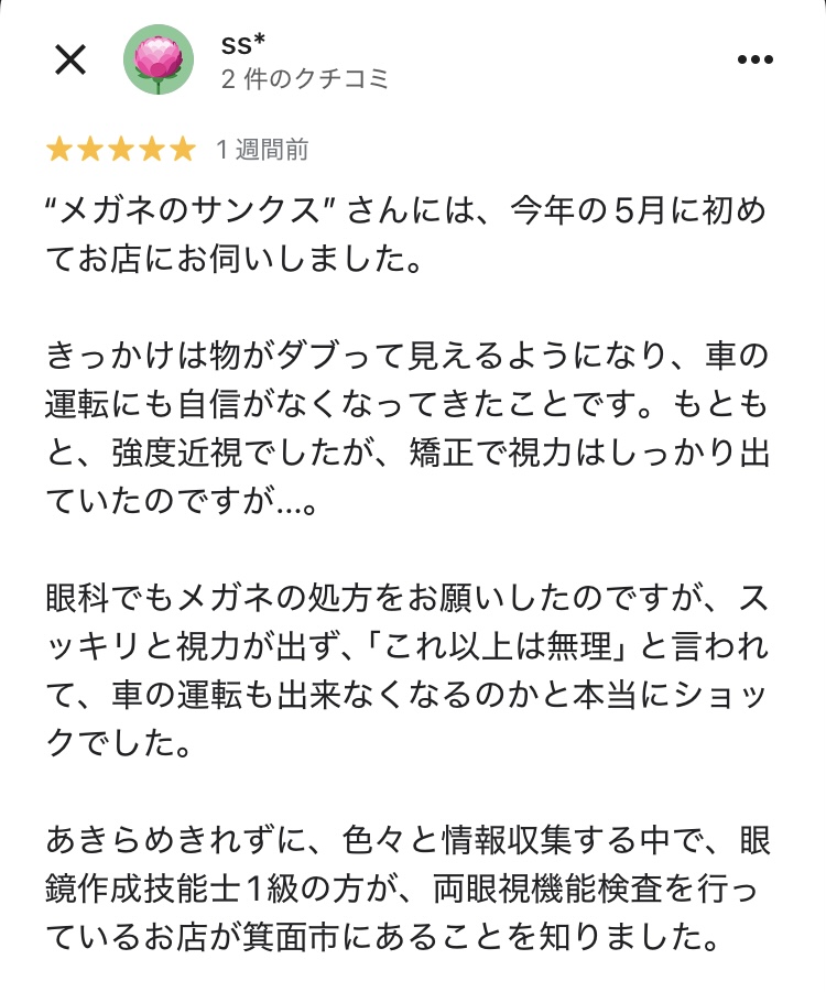 検査を行っていただく中で、“斜位”があることが分かり、プリズムレンズを調整いただき、以前のようにスッキリと見えた時は本当に嬉しかったです。生き返ったような気がしました。