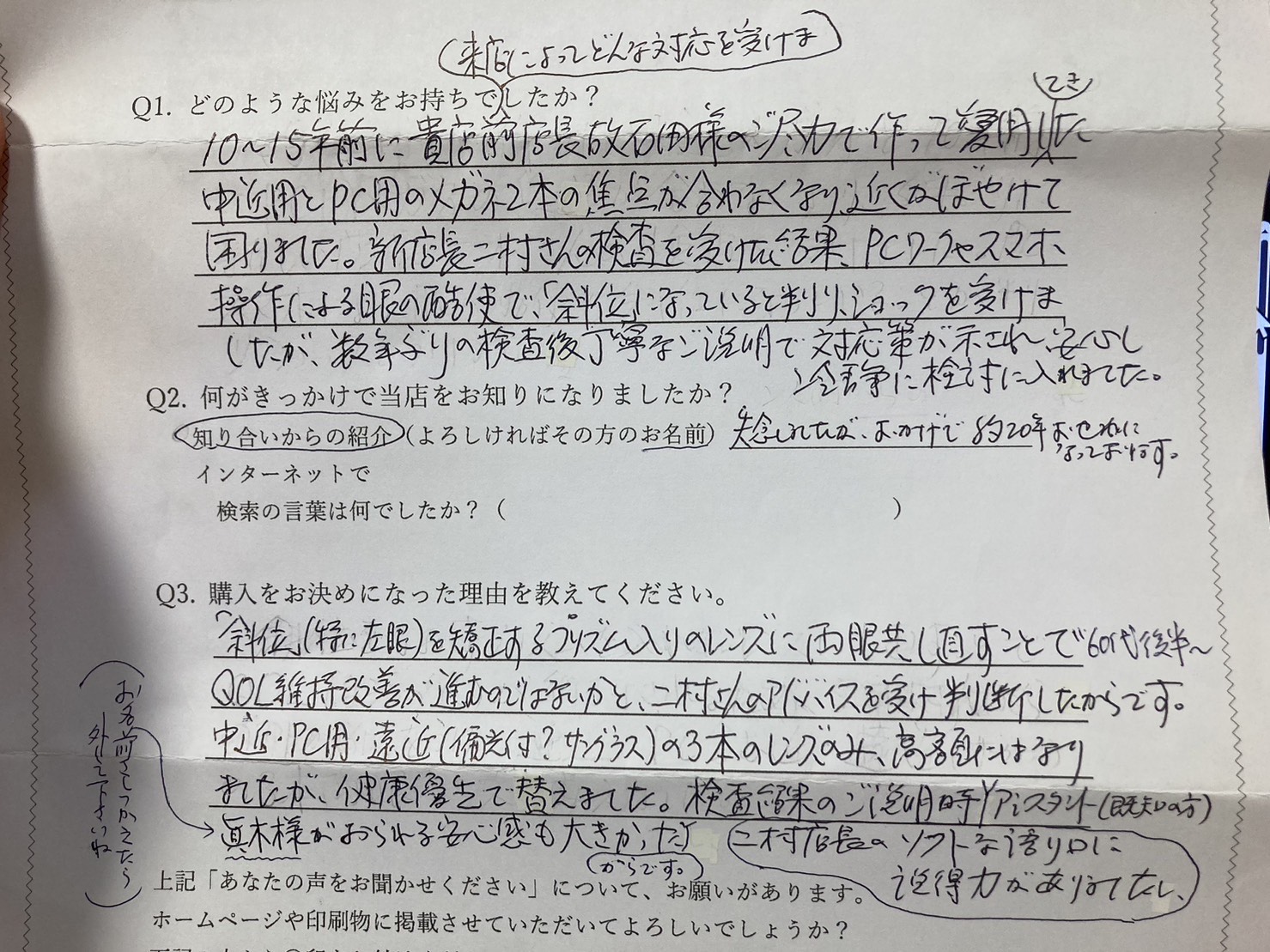 10~15年前に貴店全店長故石田様のご尽力で作って愛用てきた中近用とPC用のメガネ2本の焦点が合わなくなり、近くがぼやけて困りました。新店長二村さんの検査を受けた結果、PCワークやスマホ操作による眼の酷使で「斜位」になっていると判りショックを受けましたが、数年ぶりの検査後丁寧なご説明で対応策が示され安心し冷静に検討に入れました。