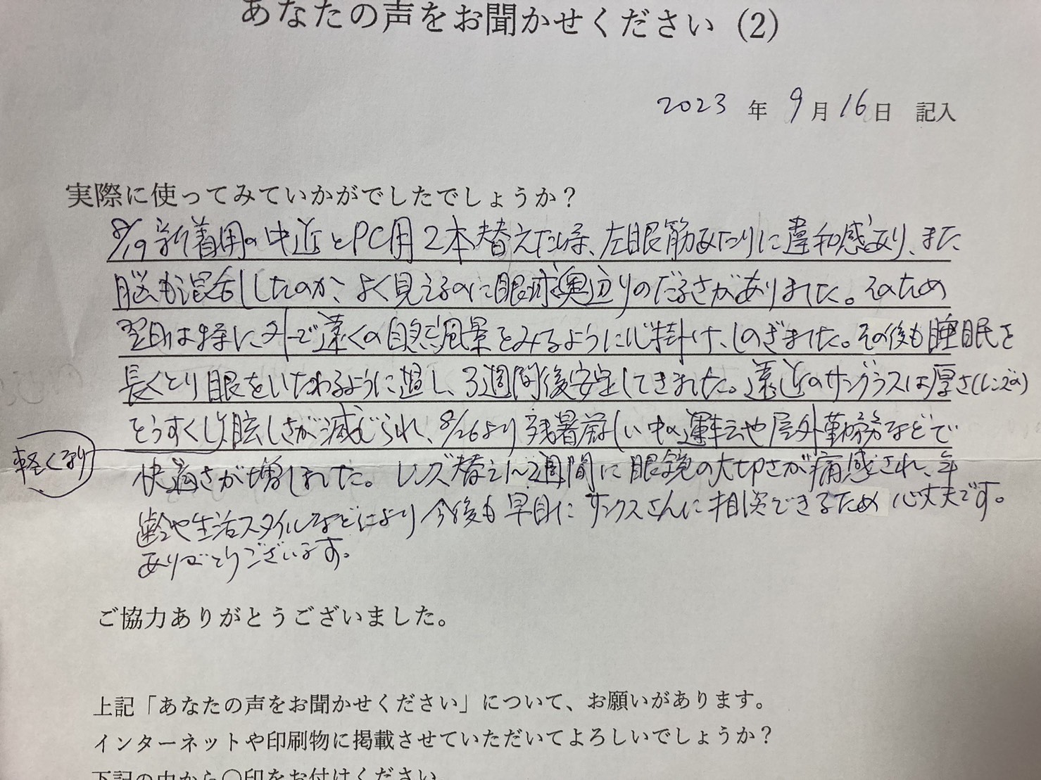 8/19新着用の中近とPC用2本替えた時、左眼筋あたりに違和感あり、また脳も混乱したのかよく見えるのに眼球奥辺りのだるさがありました。そのため翌日は特に外で遠くの自然風景をみるように心掛けしのぎました。その後も睡眠を長くとり眼をいたわるように過ごし3週間後安定してきました。遠近のサングラスは厚さ(レンズの)をうすくし軽くなり眩しさが減じられ、8/26より残暑厳しい中の運転や屋外勤務などで快適さが増しました。レンズ替え1~2週間に眼鏡の大切さが痛感され、年齢や生活スタイルなどにより今後も早目にサンクスさんに相談できるため心丈夫です。ありがとうございます。