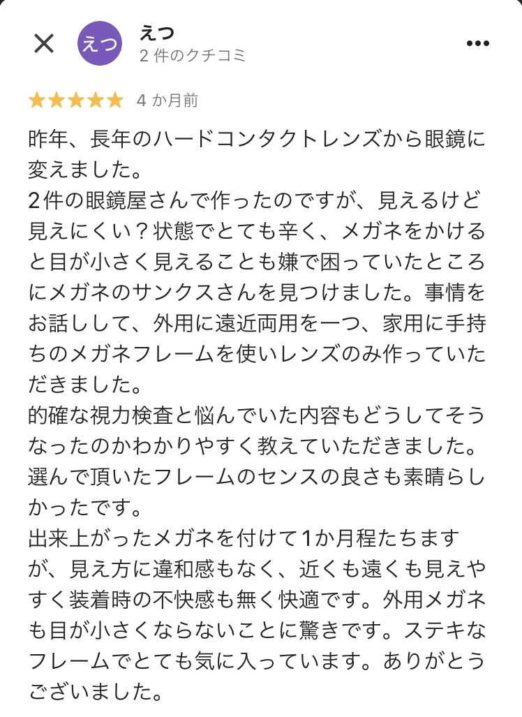 2件の眼鏡屋さんで作ったのですが、見えるけど見えにくい?状態でとても辛く、メガネをかけると目が小さく見えることも嫌で困っていたところにメガネのサンクスさんを見つけました。事情をお話しして、外用に遠近両用を一つ、家用に手持ちのメガネフレームを使いレンズのみ作っていただきました。