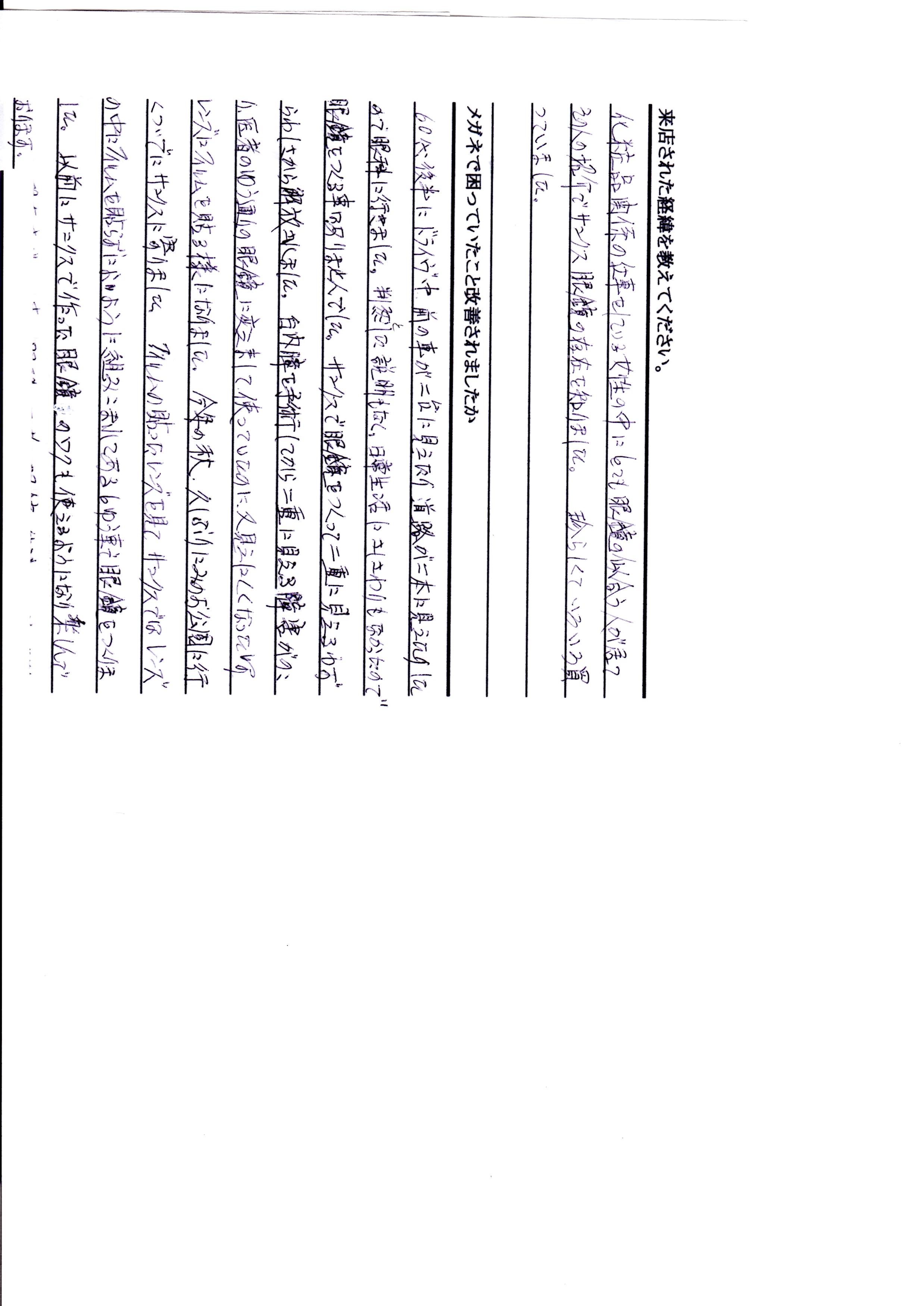 60代後半にドライブ中 前の車が二台に見えたり、道路が二本に見えたりしたので、眼科に行きましたが判然とした説明もなかったため、その時は眼鏡を作ることはしませんでした。ところが次第に日常生活に差し障りが出てきたため、サンクスで眼鏡を作ったところ、物がはっきりと見えようになり、二重に見えるわずらわしさから解放されました。